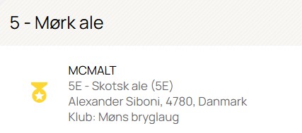 I 2025 vandt Møns bryglaug igen guldmedajle, denne gang ved Alexander Siboni som deltog bla. i kategorien Mørk ale. Alexander havde brygget en skotsk ale som han navngav McMalt, og som fik guld i kategorien “mørk ale” med 43 point – 2 point fra verdensklasse. 18 deltagere i den kategori.